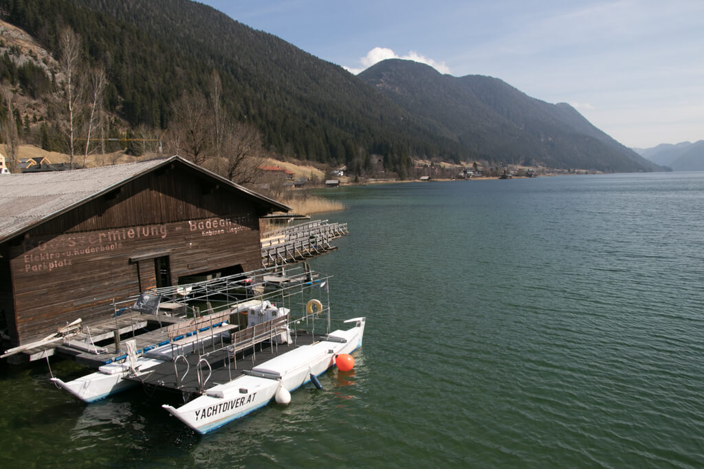 Wir gehen es hingegen gemütlich an und lassen auch das Familienskigebiet an der Naggler Alm links liegen, welches wir von hier aus ebenfalls zu Fuß erreichen könnten. Stattdessen spazieren wir am Campingplatz vorbei weiter am Seeufer entlang. Dabei kommen wir auch an einer Tauchschule vorbei und erfahren: hier kann man im Winter auch Eistauchen! Die liebe Anita auf Reisen hat sich das bereits im Februar mal angesehen.