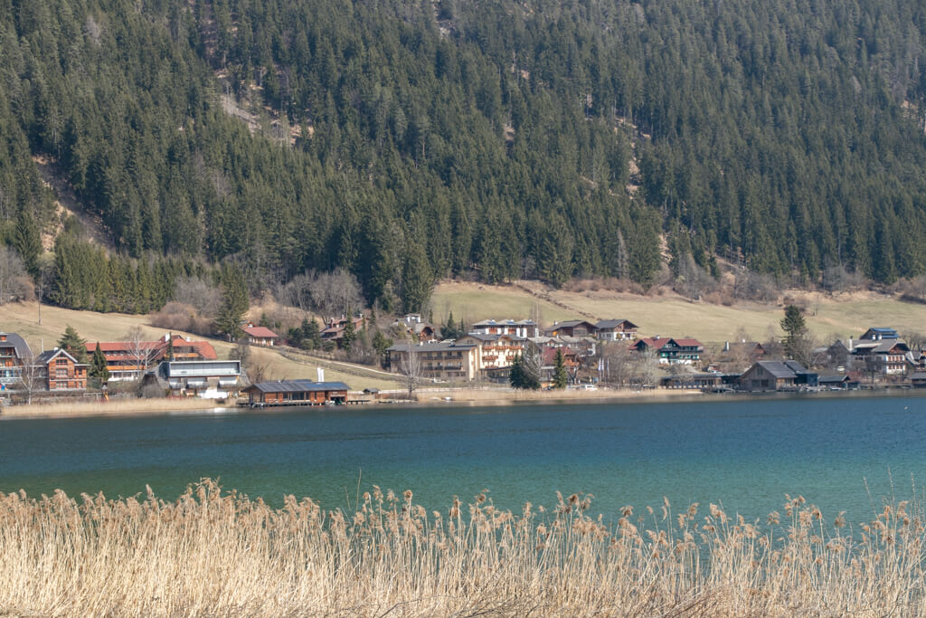 Wir parken unser Auto beim Bio-Vitalhotel Weissenseerhof in Neusach, da wir hier später noch zum Mittagessen einkehren. Zunächst wollen wir aber bei einem Spaziergang die Sonne genießen und den See aus der Nähe erkunden. Am nördlichen Seeufer entlang marschieren wir ein paar hundert Meter zurück nach Techendorf, wo wir über die einzige Brücke den Weissensee an seiner schmalsten Stelle überqueren.
