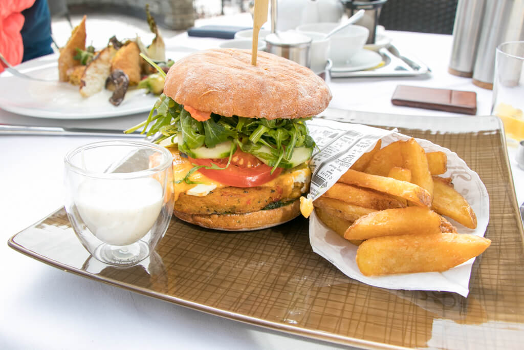 Bei der Wahl der Hauptspeise bin ich zunächst skeptisch, ob ich vom Weissenseer „Vegi Burger“ überhaupt satt werde. Doch ich werde eines Besseren belehrt: Der Gemüselaibchen-Burger ist mit Gurken, Feta, noch mehr Rucola (yeah!) und Tomaten-Wacholder Salsa ordentlich garniert, dazu gibt es noch ein paar Kohlenhydrate in Form von hausgemachten Kartoffelspalten und einen pikanten Minz-Dip. Uff, gerade noch geschafft!